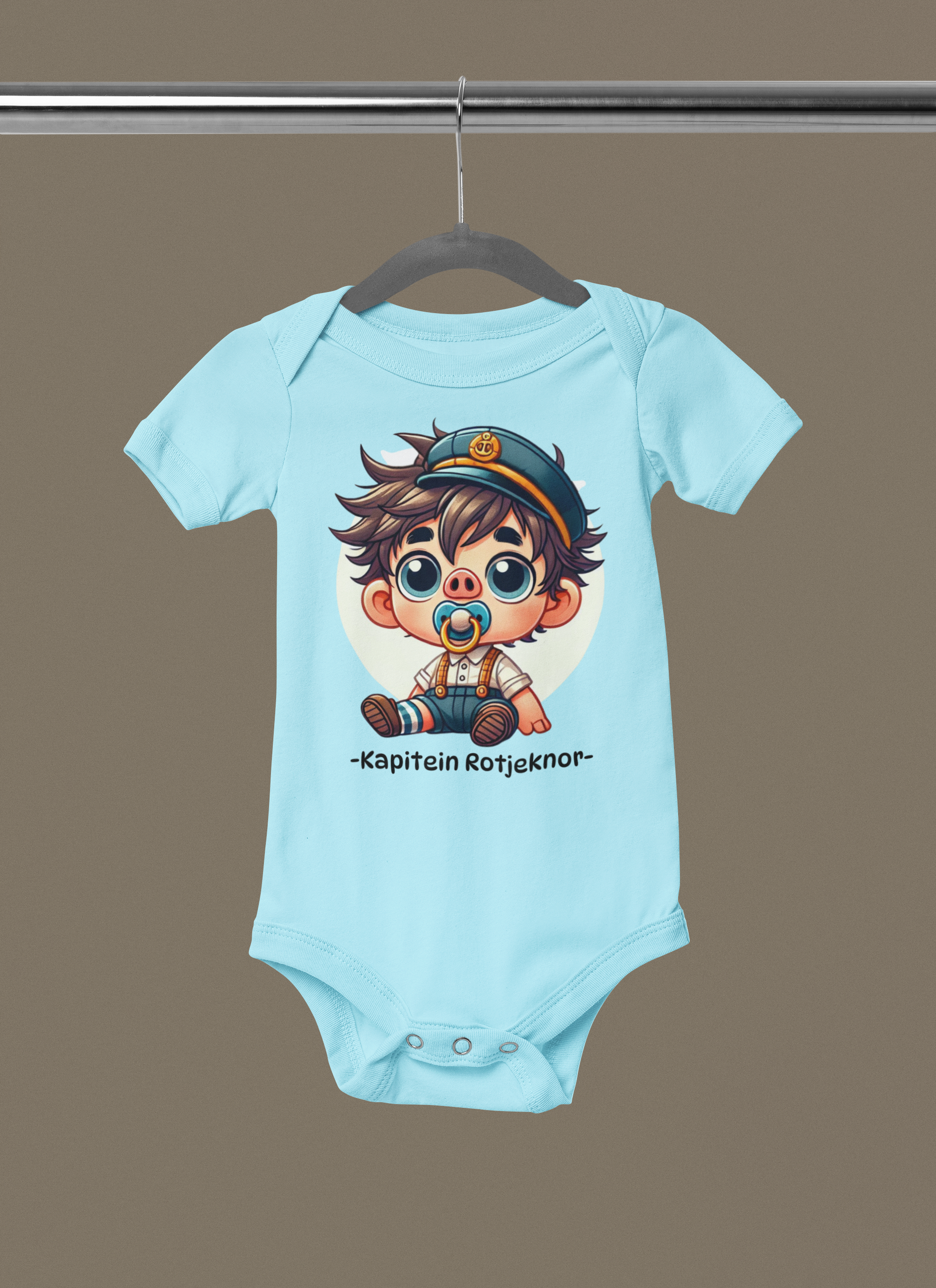 Ahoy, kleine kapitein! Met het Kapitein Rotjeknor-rompertje is je kleintje altijd klaar om koers te zetten naar avontuur. Dit schattige design toont Rotjeknor als een stoere kapitein, compleet met zeemanspet en speen, en straalt Rotterdamse trots en charme uit.