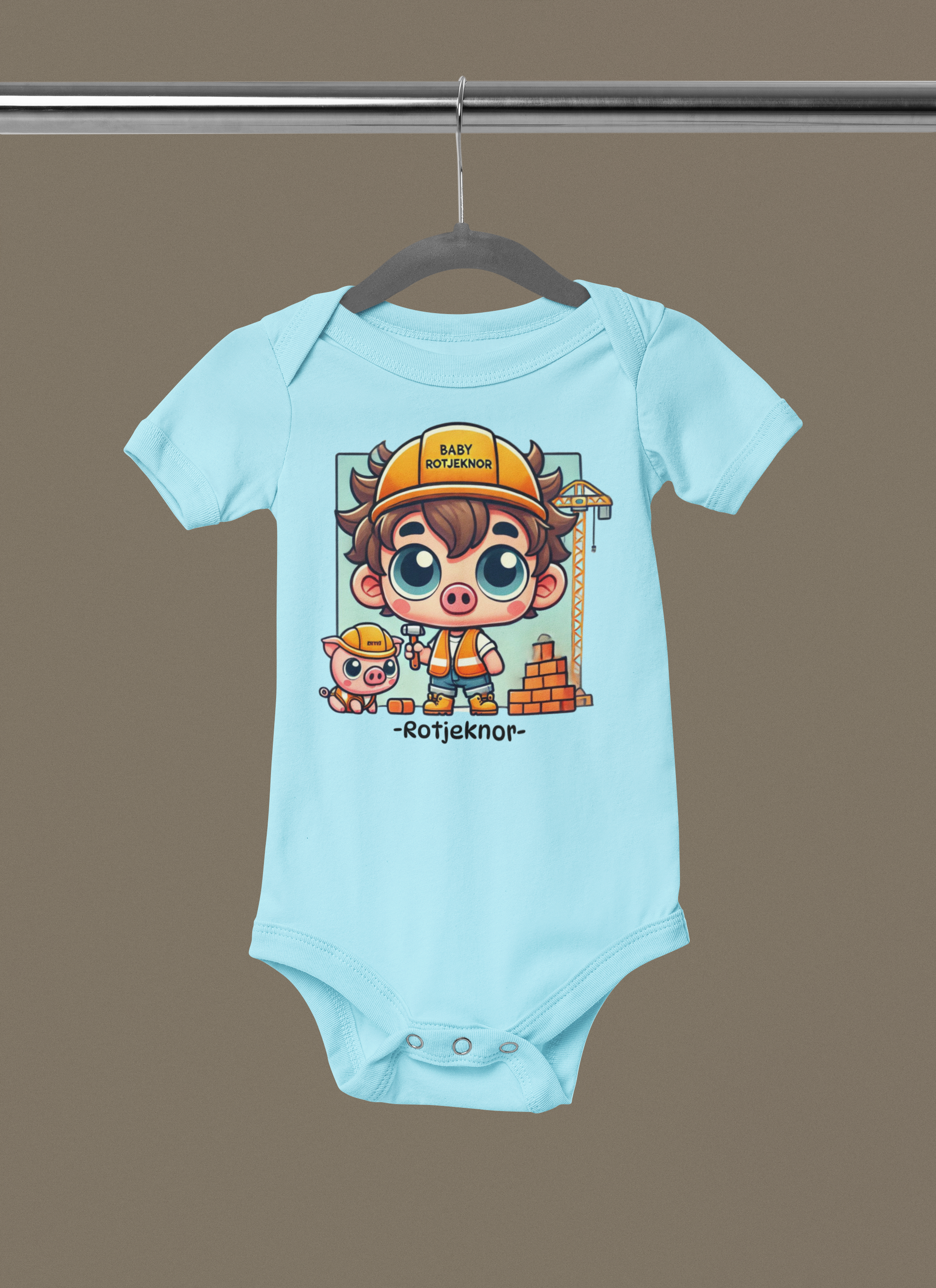 Bouw aan de toekomst met het Rotjeknor als Bouwvakker rompertje! Dit schattige ontwerp toont Rotjeknor in een bouwvakkersoutfit, compleet met helm, gereedschap en zijn trouwe maatje Knor in bijpassende veiligheidskleding. Perfect voor kleine Rotterdammertjes die vanaf dag één klaar zijn om Rotterdam verder op te bouwen.