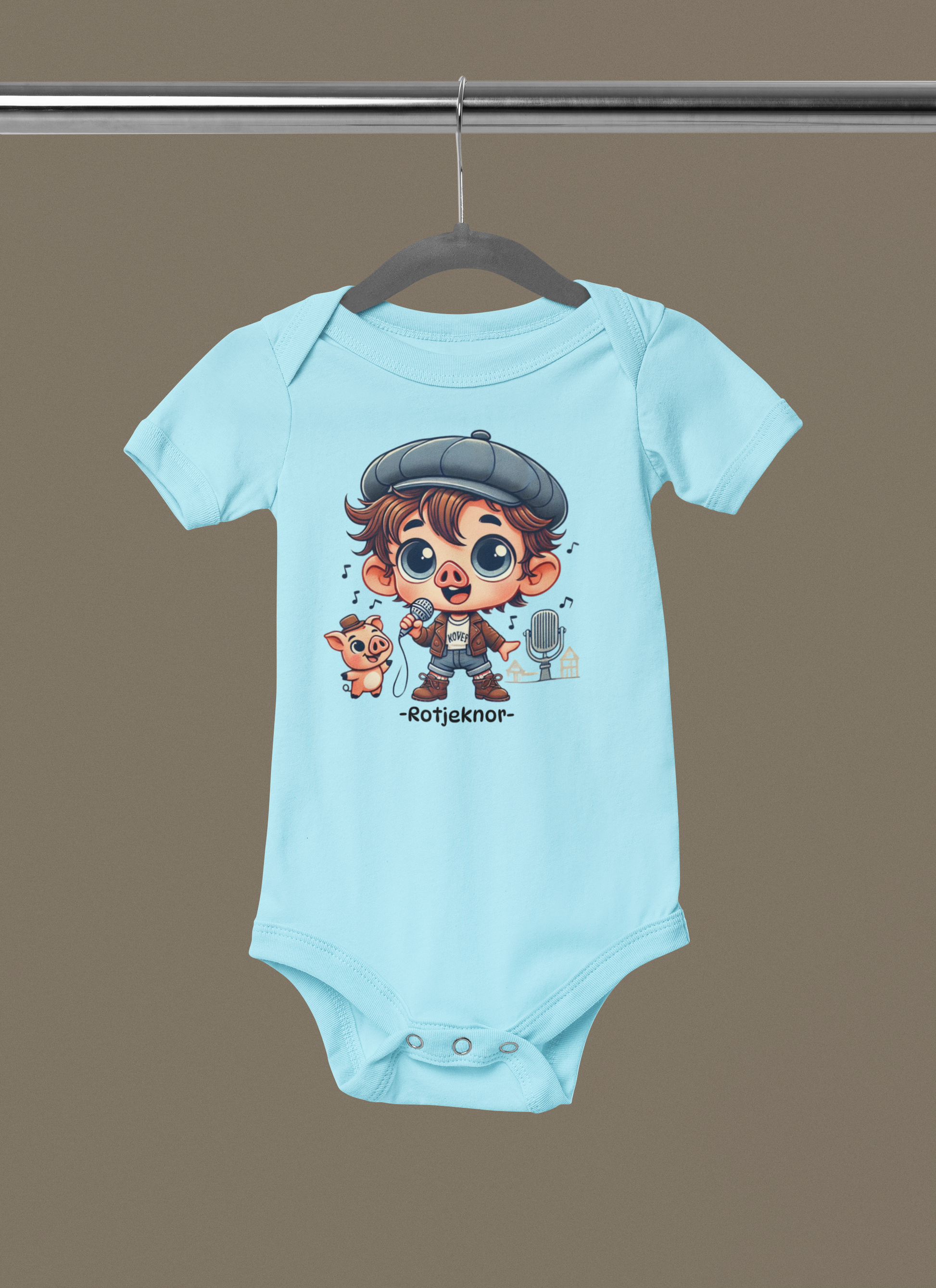 Breng de Rotterdamse haven naar de garderobe van je kleintje met het Rotjeknor als Havenzanger rompertje! Dit unieke design laat Rotjeknor zien in zijn charmante havenzangersoutfit, compleet met microfoon en zijn trouwe maatje Knor aan zijn zijde. Perfect voor kleine Rotterdammertjes die de stadsmuziek en cultuur van Rotterdam willen vieren.
