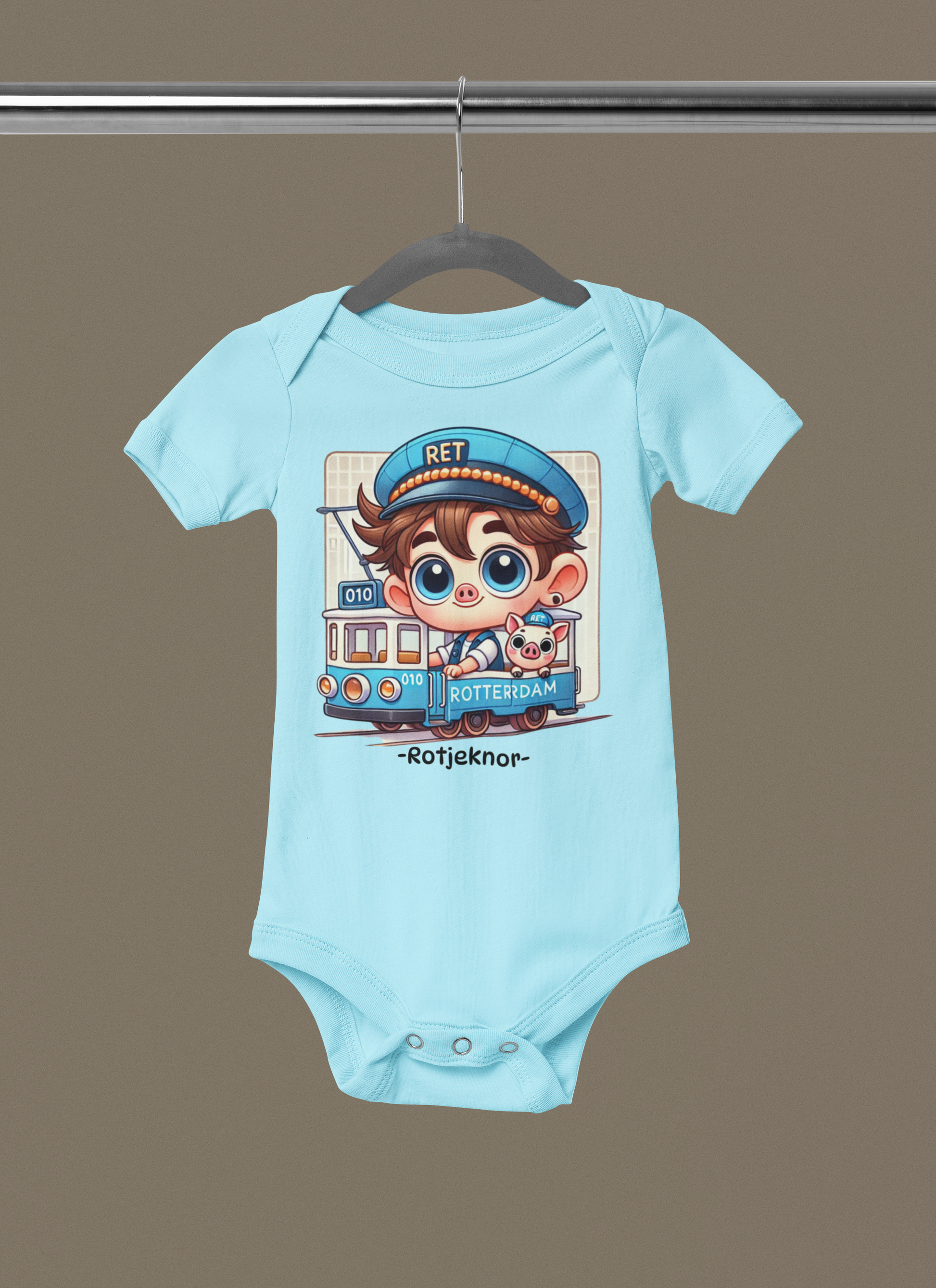 Stap aan boord met het Rotjeknor als Trambestuurder rompertje! Dit schattige ontwerp toont Rotjeknor in zijn iconische RET-uniform, achter het stuur van een klassieke Rotterdamse tram, samen met zijn trouwe maatje Knor. Perfect voor kleine Rotterdammertjes die al vroeg liefde voor de stad en het openbaar vervoer willen uitstralen.