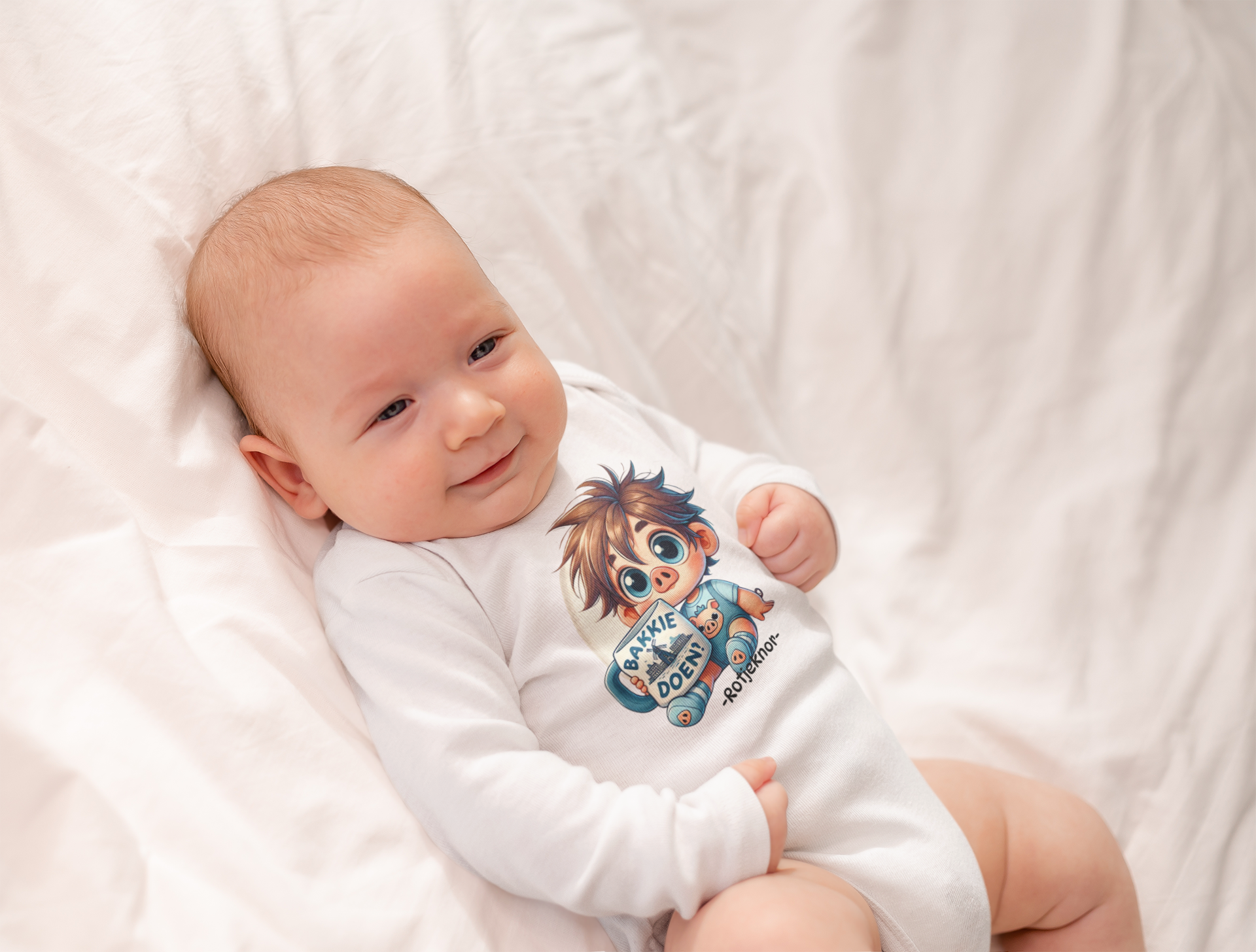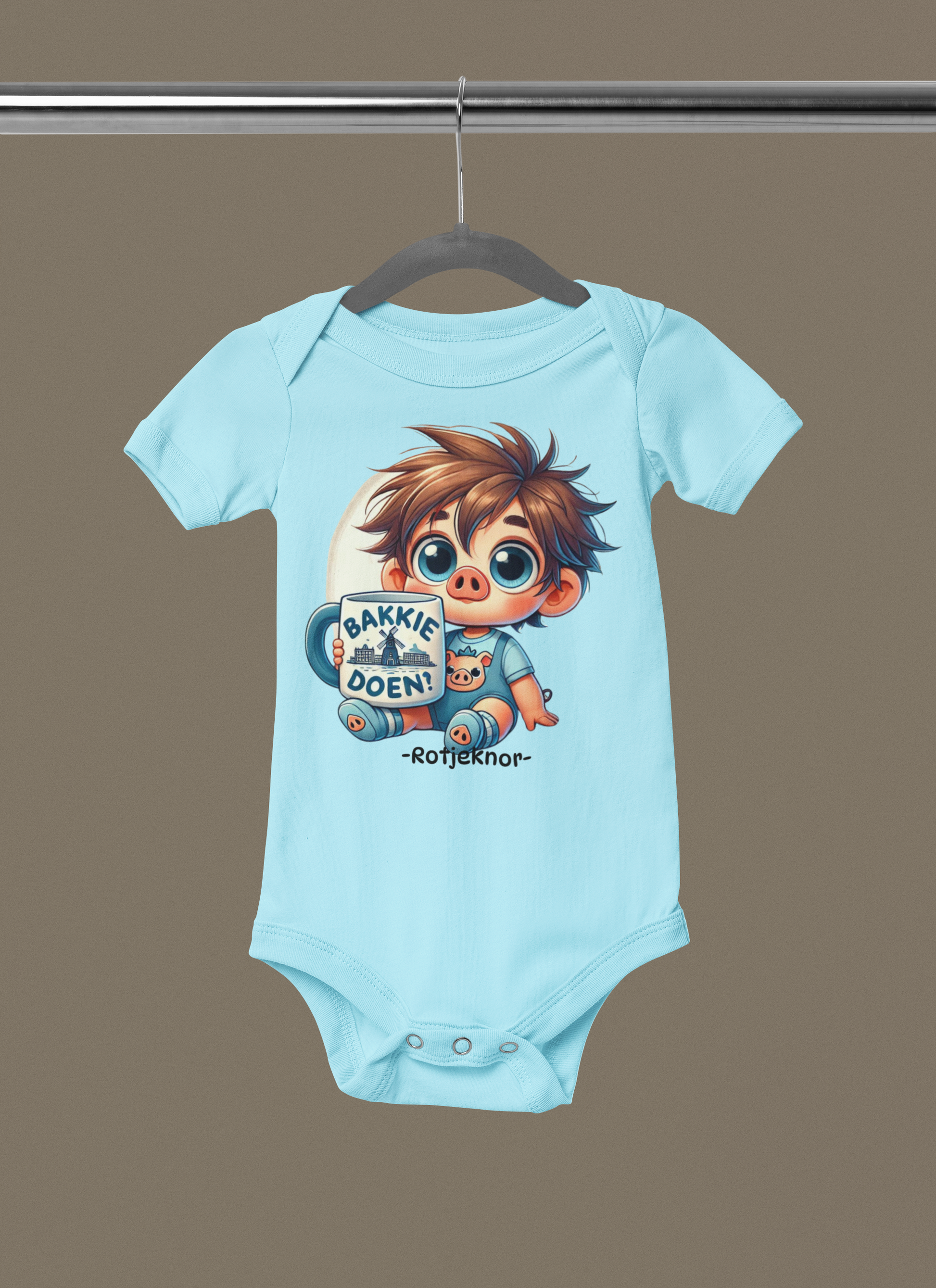 Begin de dag met een glimlach (en een groot bakkie) met het Rotjeknor met Grote Mok rompertje! Dit vrolijke design toont Rotjeknor met een grote mok waar de tekst “Bakkie doen!” op staat, samen met een schattige Knor op de achtergrond. Perfect voor kleine Rotterdammertjes met grote plannen!